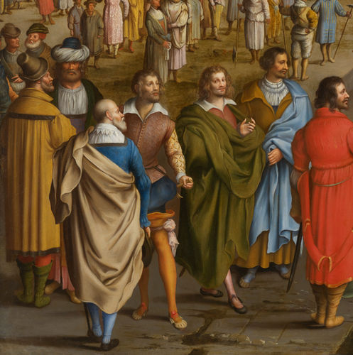 Bien qu’Italien, Cristadoro emploie ici un schéma de composition propre aux écoles du Nord dans l’articulation des XVIe et XVIIe siècles, ce alors qu’il peint dans les années 1650 où l’art baroque triomphe partout en Italie. Au lieu de déployer une scène pleine de pathos conformément au goût pour les figures larges et empathiques, il choisit de représenter une foule de petits personnages s’étalant sur plusieurs plans, au premier rang desquels se déroule la nativité avec son cortège d’adorateurs où le peintre s’est représenté scrutant le spectateur. A droite, la Sainte Famille est isolée près d’une ruine antiquisante dans laquelle est improvisée une étable, ceci selon un schéma emprunté aux peintres du Nord au premier rang desquels figure Albrecht Dürer. A l’arrière-plan, toute une ville semble vivre et s’agiter, tantôt intéressée par la venue du sauveur de l’humanité, tantôt indifférente. Alors que certains s’agglutinent à droite vers l’étable, la plupart de ces petits sujets conversent, commercent ou chassent. Si petites soient-elles, ces figures relèvent bien d’une manière italienne, caractérisées par la recherche de la beauté plutôt que par le naturalisme. Enfin, alors que la majorité de l’architecture ornant la composition est italianisante ou antiquisante, le grand bâtiment à gauche est clairement inspiré de l’architecture civile des Pays-Bas avec son toit à pignon en échelons.